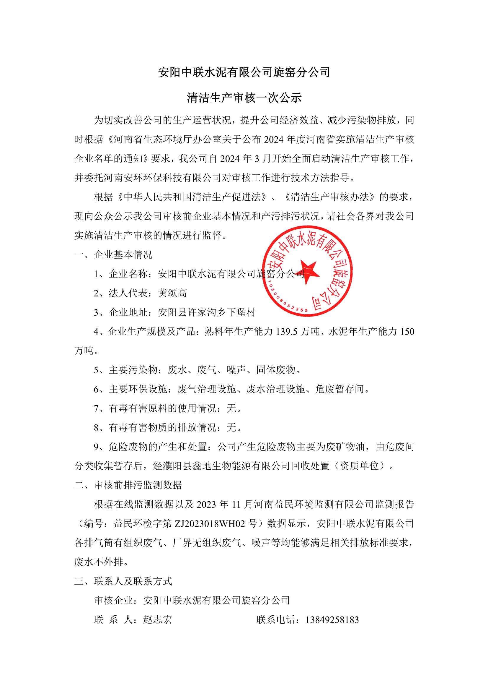 根據(jù)環(huán)境保護(hù)部《關(guān)于發(fā)布<建設(shè)項(xiàng)目竣工環(huán)境保護(hù)驗(yàn)收暫行辦法>的公告》(國環(huán)規(guī)環(huán)評[2017]4號),第十一條第(一)項(xiàng):“建設(shè)項(xiàng)目配套建設(shè)的環(huán)境保護(hù)設(shè)施竣工后,公開竣工日期?!卑碴栔新?lián)水泥有限公司旋窯分公司制砂工段設(shè)備改造項(xiàng)目配套環(huán)境保護(hù)設(shè)施于2023年9月11日建成竣工,特此公示。根據(jù)環(huán)境保護(hù)部《關(guān)于發(fā)布&l......【點(diǎn)擊詳情】